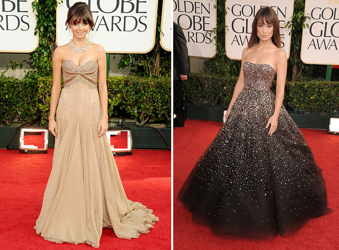 little recap for those who might have missed the original post this stems from: i loved elements of sarah hyland and olivia wilde's globes looks - gowns, hair, make-up and accessories - but thought sarah's was too old and olivia's too young. so i did a switch-a-roo. and really like the results. especially olivia. that max azria dress is perfect on her. (or "her," rather.)